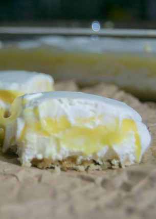 These lemon bars start with a nutty crust, then have a layer of cream cheese, confectioners' sugar and Cool Whip , then a lemon pudding layer and finally topped off with more Cool Whip! What could be better on a hot summer day?