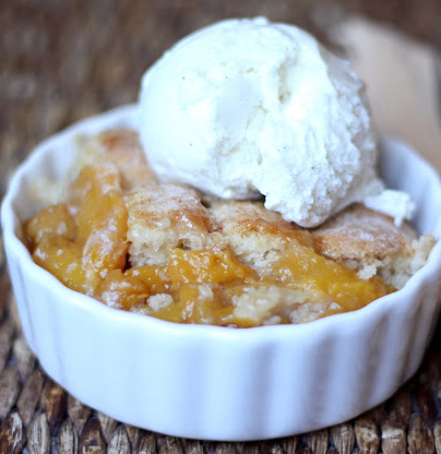 Remove peaches from the oven and drop the topping over them in spoonfuls. Sprinkle the cobbler topping with the cinnamon sugar mixture. Bake until the crust is golden and a toothpick inserted into the crust comes out clean, about 28 minutes. Serve warm or at room temperature.