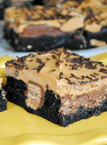 This yummy dessert has a dark chocolate, fudgy brownie layer topped with kit kat candy and then last, but not least, is topped off with butterscotch.