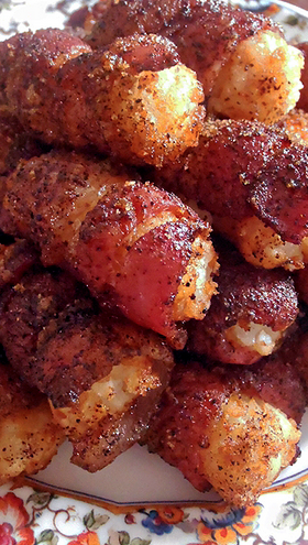 Wrap each thawed tater tot in bacon and then roll it in the brown sugar mixture. Place on top of the cookie rack.
