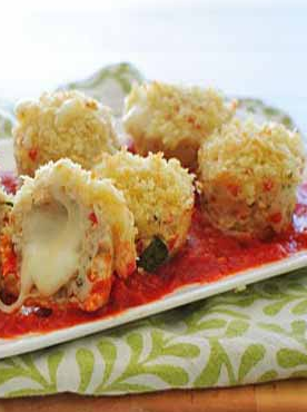 Bite-sized meatloaves filled with cheese made a little healthier by changing out the beef/pork with chicken. There is yummy goodness in every bite!