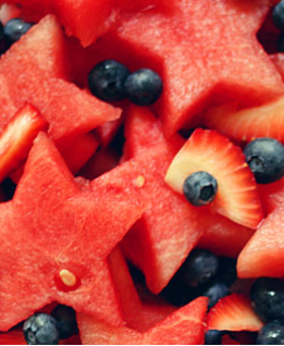 Wash blueberries and strawberries. Use a star shaped cookie cutter to cut chunks of watermelon. Slice strawberries in half. Mix watermelon, strawberries and blueberries together.