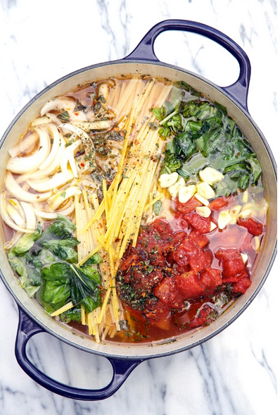 Place pasta, tomatoes, onion, garlic, basil, in a large stock pot. Pour in vegetable broth. Sprinkle in pepper flakes and oregano. Drizzle with oil.