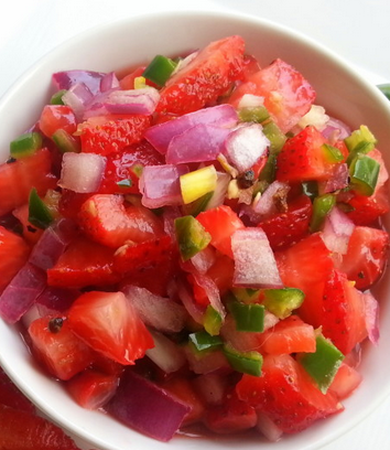 A pretty salsa made without tomatoes but with strawberries instead. The strawberries are sweet and give a nice balance to the red onion, jalapeno, lime and cilantro.
