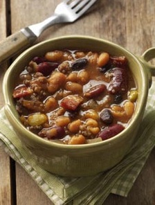 This tasty and saucy dish could be a meal or a side dish with its four types of beans, beef or turkey, and bacon.