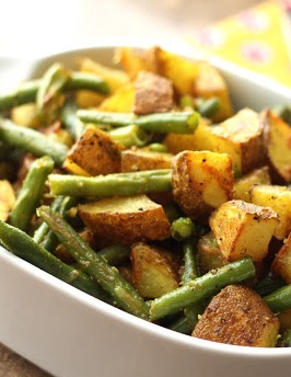 The perfect side dish of potatoes that are crisp on the outside and fluffy on the inside with fresh green beans, all seasoned with spices and cheese. Yum!