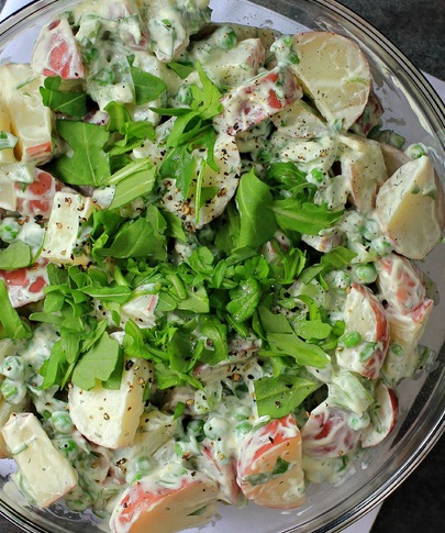 Even though this potato salad has no bacon or hard-boiled eggs, it has got to be one of the best potato salads ever. The peppery arugula, dill and sweet peas, Dijon mustard, light mayo and low fat sour cream make it tasty and a little better for you too!