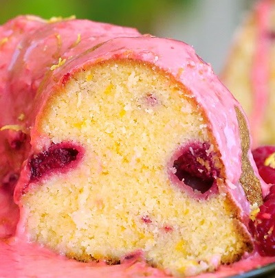 Pour batter into prepared Bundt pan. Sprinkle the reserved raspberries over top and gently press into the batter with a spatula (this will help keep the raspberries from all ending up on the top). Tap pan on the counter several times to release air bubbles. Bake 1 hour 15 minutes or until a thin sharp knife comes out of the center clean. Place on a wire rack to cool for 20 minutes. Place a plate over the pan and flip cake onto plate to continue cooling completely. You may have to tap pan a few times with a knife to release from pan.