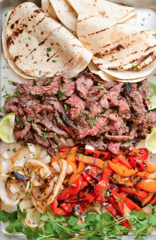 Add the peppers and onions to the grill and grill, turning occasionally until cooked, peppers should take about 5 minutes and onions will take about 10. Remove from grill. Briefly add the tortillas to the grill, a couple at a time and grill until warmed and lightly charred around the edges. Wrap the tortillas in foil to keep warm.