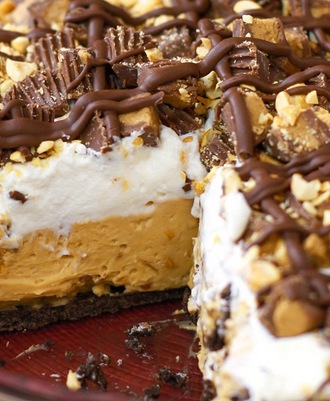 Peanut butter lovers, you will love this pie! It has a cookie and peanut butter cup pie crust, with a peanut butter filling and then topped with whipped cream, peanut butter cup chunks, chocolate and peanuts! It is not only decadent, but fast and easy too