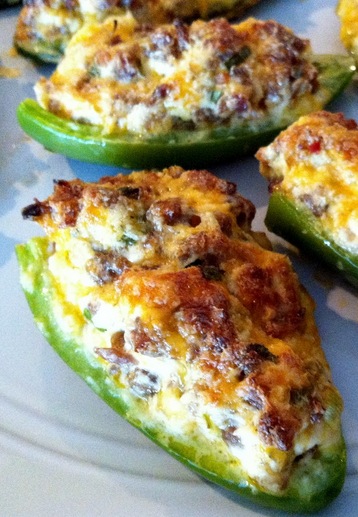 Rinse jalapeños. Cut each jalapeño in half lengthwise and remove seeds. Stuff jalapeños with sausage mixture.