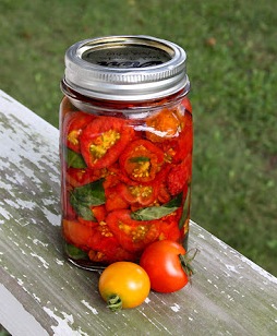When jar is dry (air-dried) place the dried tomatoes into the bottom. Use a clean spoon to pack tomatoes together. Add a few leaves of basil. Continue to layer tomatoes and basil until the jar is full. Pour olive oil slowly over the top.