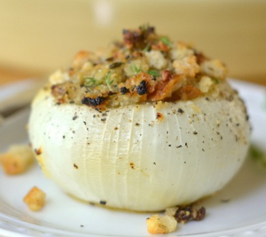 This dish could be served as a vegetarian main dish or as a side dish to the main meal. It is very similar to a stuffed pepper. Why not enjoy an onion stuffed with the goodness of seasoned bread crumbs, cheese, Herb de Provence spices and wine?