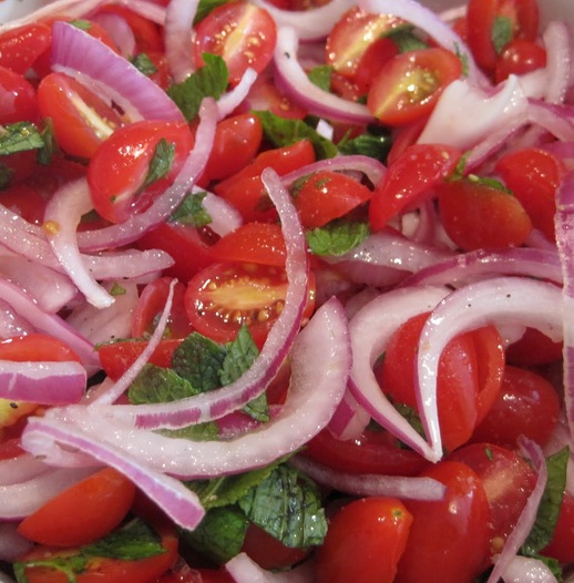 This healthy salad is delicious and beautiful too. It is simple and quick to make with just a few ingredients like cherry tomatoes, red onions and fresh mint dressed with red wine vinegar, olive oil, salt and pepper.