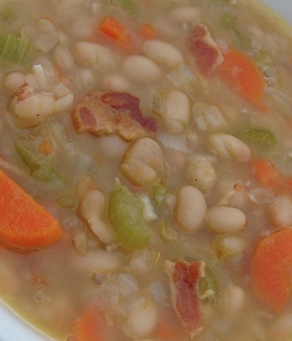 Cook chopped carrot in the saucepan with the bacon drippings over medium heat, and cook for 5 minutes, then add celery, onion, and garlic, stir and cook for 3 minutes. Add beans and 2 cups water. Bring to a boil and cover, then reduce heat to low. Let simmer for 10 minutes.