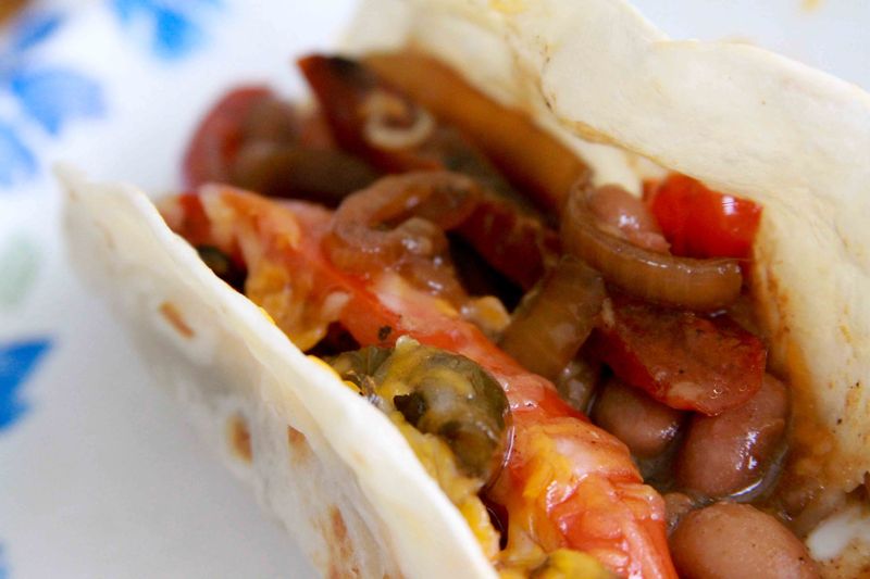 Layer in order of above ingredients, except the tortillas. Put in crock pot.