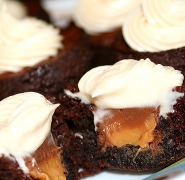 Rolo Brownie Bites with Caramel Cream Cheese Frosting