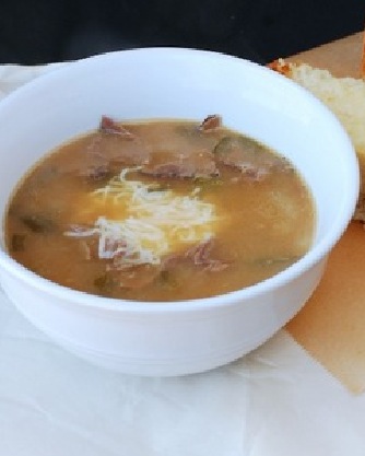 The flavors in this soup are reminiscent of the famous Philly Cheese Steak Sandwich that everyone loves. It combines the roast beef, green peppers, onions, and mushroom soup in a warm broth. It is all topped with shredded cheese and served with toasted Fr