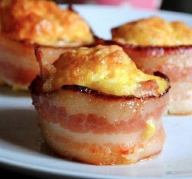 Whip the eggs, salt, pepper and cheese with a fork. Spray non-stick spray in 12 muffin tins. Wrap each piece of bacon inside the sides of each muffin cup.