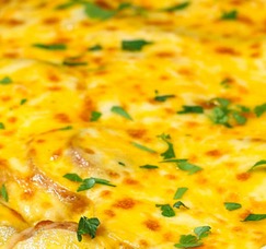 Spray aluminum foil with non-stick spray and lay sprayed side down on the casserole. Bake for 75-90 minutes or until potatoes are tender. Uncover and place under the broiler for 2-3 minutes or until the cheese is golden brown.