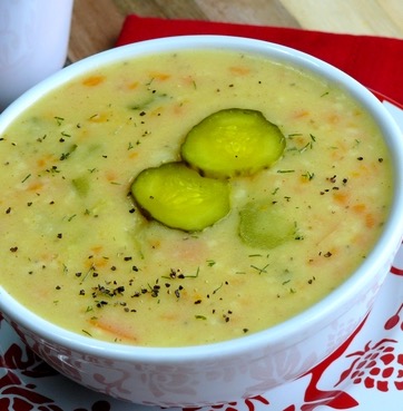Saute carrots in butter. Combine that with 5 cups chicken stock, and potatoes in a saucepan. Bring to a boil and cook until the potatoes are tender. Add the pickles and continue to boil.