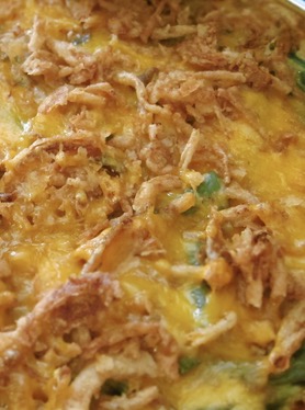 Combine first 5 ingredients, Stir. Spread French fried onion rings on evenly over the top.