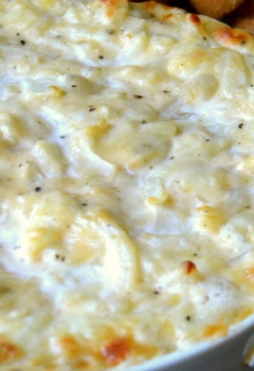 While the dip is baking, slice a baguette and place the slices on a hot grill pan to toast them on both sides. Serve with the hot dip.