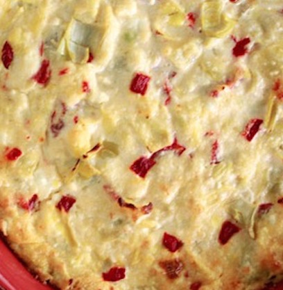 This warm, rich and creamy dip features garlic, artichoke heards, 2 differents cheeses, mayo and pimentos all mixed, heated and served on chips or Melba toasts or whatever you prefer. Make it for the holidays!