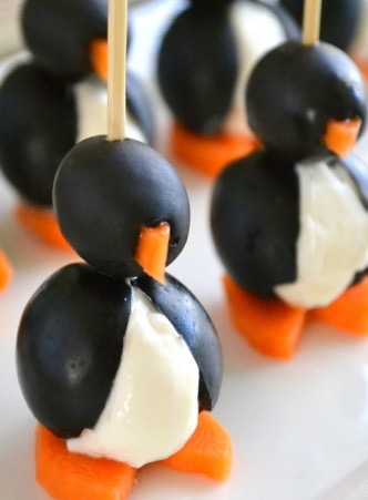 Slice carrots into circles and cut triangular dicots out of it for feet. Cut large, black olives in half for the body and wings. Roll cream cheese into balls for the white part of the body. Wrap 2 black "wings" around the cream cheese ball and put on top of 2 carrot feet. Take a large cocktail skewer or tootpick and put it through the center of the olive wrapped cream cheese ball and then take a smaller black olive and push it down the center to touch the body. This is the head. Cut little bits of carrots for the beak and attach. (It might be easier if you stuff the "beak" into the hole of the olive, so be sure to attach the "head" so that the olive hole is in the front of the face.)