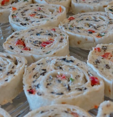 Roll up tortillas; wrap in plastic wrap and refrigerate overnight. Slice into ¼ inch slices before serving.