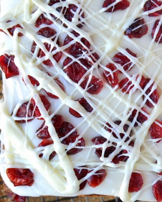 For the frosting, mix sugar with enough milk or cream to create a thick spreadable consistency. Blend in the vanilla. Spread over the top of the cooled cake. Scatter with dried cranberries.