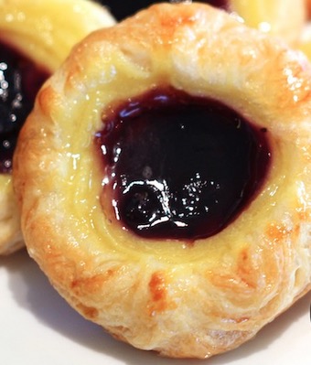 These little treats make a delicious breakfast/brunch or a tasty dessert. It's easy because it is made from a store-bought frozen puff pastry, filled with cheese and fruit. Yum!