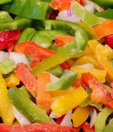 Slice peppers and onions, then place them on the bottom of the crock pot. Place chicken on top of peppers and onions. Sprinkle taco seasoning on top.