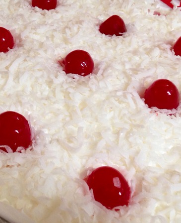 Pour over the vanilla wafers in the dish. Add another layer of the vanilla wafers on top of the pineapple mix. Then top with whipped topping, coconut and lastly, cherries.