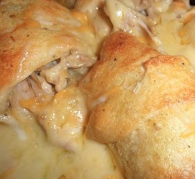 Unroll crescent dough and separate into triangles. Place a little cheese over the dough and at the larger end place a good heaping of the chicken. Roll up and place in a 9x13 casserole dish. Repeat with remaining ingredients. Once all are in the dish, pour soup mix around each one and drizzle a little bit over the tops.