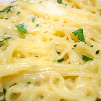 Add the cooked pasta to the saucepan with the garlic and olive oil. Stir in grated Parmesan, a generous amount of black pepper and parsley, if using. Season with salt to taste.