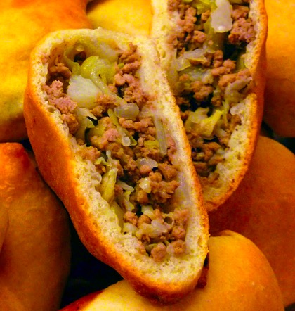 Cut the dough into 5×5 inch squares. Put a generous portion of the beef mixture in the middle of each square. Gather all corners together and pinch shut each diagonal seam toward the center. Turn upside down on a baking sheet.