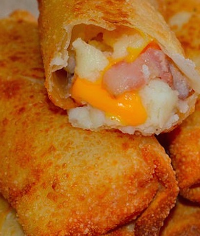 Lay each egg roll wrapper out with a corner pointing towards you. Place mashed potato mixture and 1 slice of cheese in the center of each wrapper. Fold in the sides and roll the wrapper tightly.