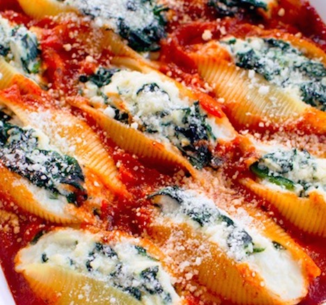 Pour 1/2 cup marinara sauce into the bottom of the baking dish. Stuff each pasta shell with a generous amount of the spinach and ricotta mixture, then place in the baking dish.
