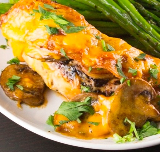 Transfer the chicken to an oven safe casserole dish. Spoon some of the mushrooms on top of each piece of chicken. Break a piece of cooked bacon in half and arrange the bacon over the chicken.