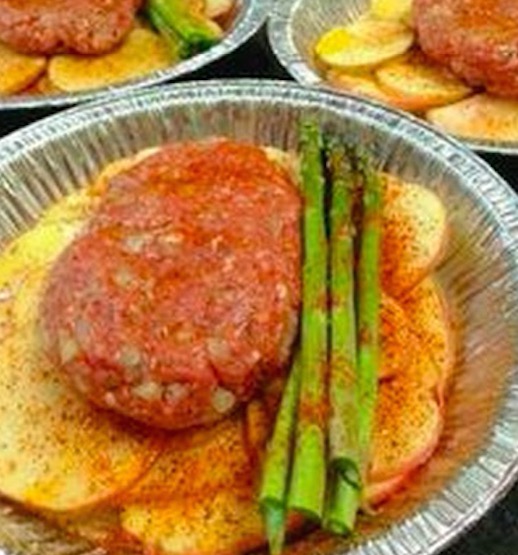For each person thinly slice (about 1/8 inch) 2 red potatoes and place in pie pan or on a big piece of foil.