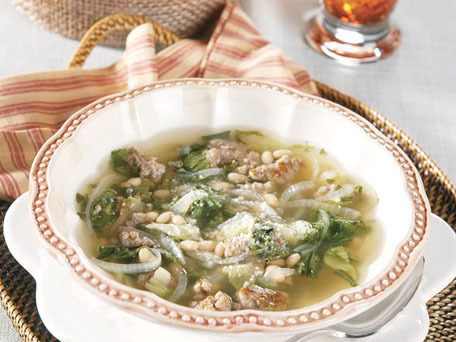 Bring a large pot of salted water to a boil. Add the escarole, return to a boil, and cook until wilted, about 1 minute. Remove escarole with a slotted spoon and set aside. Boil the chicory in the same pot of water until wilted, about 1 minute, and remove with a slotted spoon. Set aside. Boil the cabbage until wilted, about 2 minutes, and remove with a slotted spoon. RESERVE 5 cups of the cooking water and set aside.
