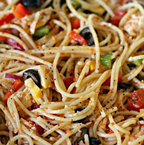 This pasta salad is so full of goodies, it can be served as a main dish as well as a side or as a salad.