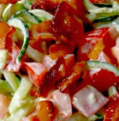 Peel and slice cucumbers. Add in tomato, spices and mayo. Stir. Add crumbled bacon.