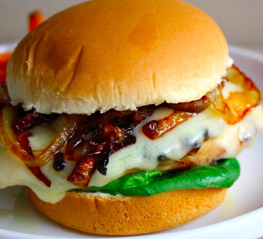 Spread the bottom half of each bun with 1 1/2 teaspoons Dijon mustard. Top with fresh spinach, then the cheese-topped chicken, caramelized onions, and finally the top bun half.