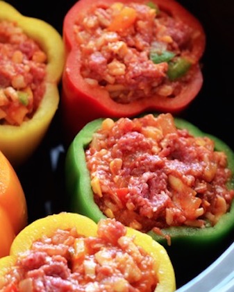 Making stuffed peppers were never so easy. The only thing you need to cook ahead of time is the rice. Prepare the green peppers, fill them with the meat/rice mixture, place in the slow cooker and forget about them until dinner!