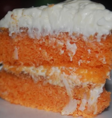 Mix the box of orange jello with the boiling water. When thoroughly mixed, pour it over the cake; refrigerate.