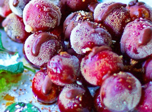 Right before serving, remove them from the freezer, melt the chocolate, and drizzle it on top of the sugared grapes.