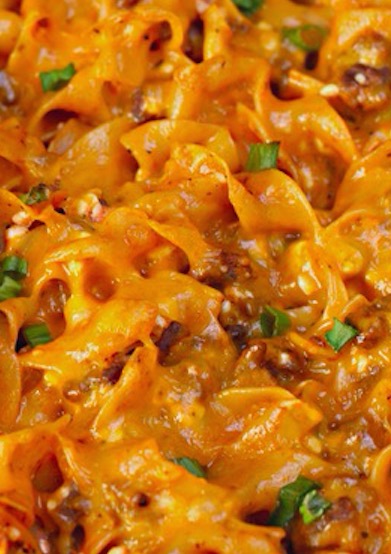 Place noodle and meat mixture in the prepared baking pan; top with shredded cheese. Cook 20-25 minutes.