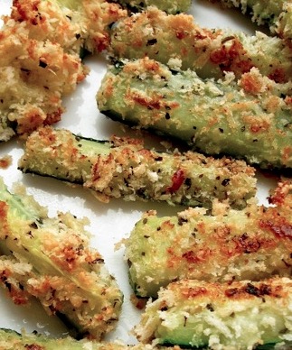 Dredge zucchini sticks a few at a time in the egg, then roll in the crumb mixture. Place the sticks on the prepared baking sheet.